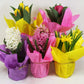These are indoor plants. Each box will contain 30 plants - 10 Tulips, 10 Daffodilis, and 10 Hyacinths. All the plants will have color-coordinated Mylar wraps, and be in an assortment of colors. Great for an organization looking for a new type of fundraiser.