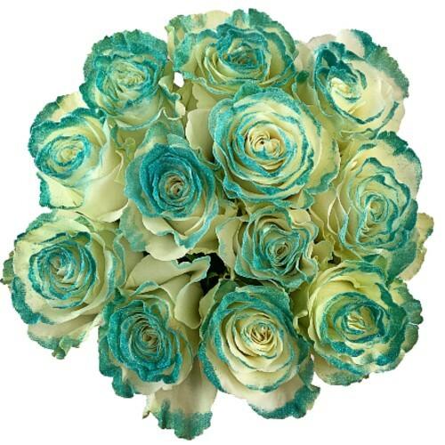 12 Stem White Rose with Teal Blue Glitter Rose Bouquets - Require 7 Days Advance Notice!